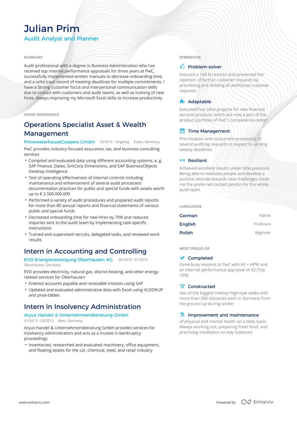 Julian shows how even someone working in a field like audit analysis can have a resume which shows both personality and results. You can see his attention to detail as well as his devotion to the improvement of both company processes and himself.
