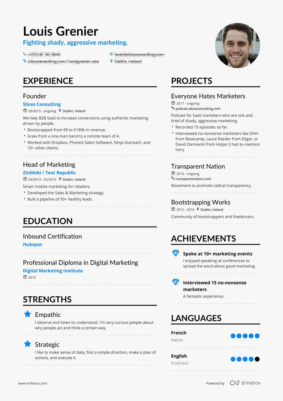 Louis' resume shows that he's not just an accomplished professional but that his career has a clear mission behind it: to fight shady and aggressive marketing. That mission binds together his projects from Everyone Hates Marketers, his current work at Hotjar, and his achievements to create a cohesive story that really has an impact.